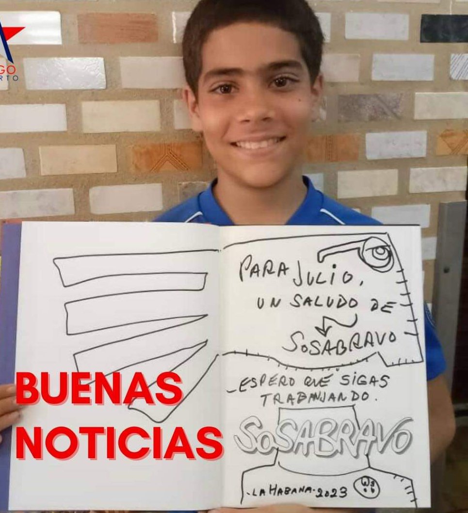 “Y llega el día en que te sientes la persona más afortunada del mundo, solo por ver a tu hijo sonreír. Hoy mi hijo ha recibido un regalo maravilloso del gran pintor Alfredo Sosabravo, en quien él encontró fuente de inspiración para su dibujo”, expresó la madre.