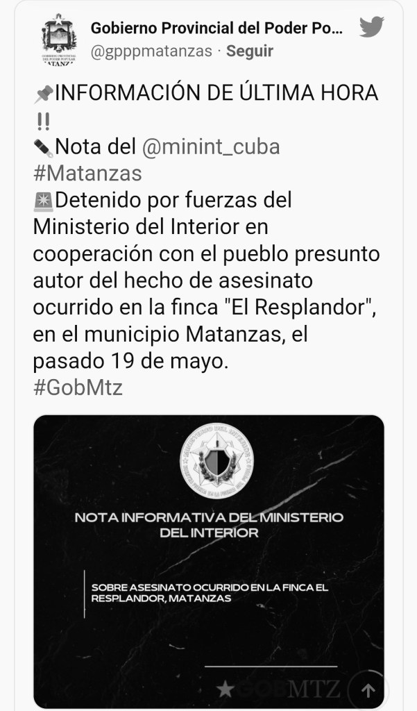 «Detenido por fuerzas del Ministerio del Interior en cooperación con el pueblo presunto autor del hecho de asesinato ocurrido en la finca «El Resplandor», en el municipio Matanzas, el pasado 19 de mayo.» dice la escueta nota del Ministerio del Interior en redes sociales