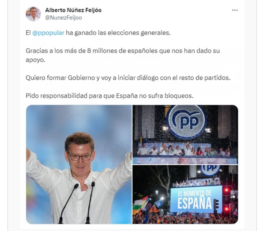 🛑 ESPAÑA|Los partidos políticos analizarán este lunes los resultados de las elecciones generales celebradas el domingo, que dejan un escenario mucho más abierto de lo que apuntaban las encuestas. El PP ha ganado en votos y en escaños, pero el bloque de la derecha no consigue la mayoría absoluta. Desde el balcón de Génova, las primeras declaraciones de Alberto Núñez Feijóo tras la jornada electoral fueron para recordar que le corresponde a él intentar formar gobierno: “Pido que nadie tenga la tentación de volver a bloquear España”. El líder de Vox, que ha perdido 19 escaños hasta quedarse en 33, culpó directamente a Feijóo de los resultados por el “blanqueamiento” del Gobierno de Sánchez, según las palabras del líder de la formación de ultraderecha, Santiago Abascal.
