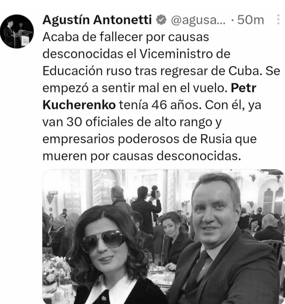 Kucherenko participó en la XX sesión de la Comisión Intergubernamental Cuba-Rusia. El dictador cubano Miguel Díaz-Canel, transmitió este domingo sus condolencias por la muerte. «Con profundo dolor conocimos del fallecimiento del viceministro ruso Piotr Kucherenko, al regreso a su país tras realización en nuestra nación de la Comisión Intergubernamental.»