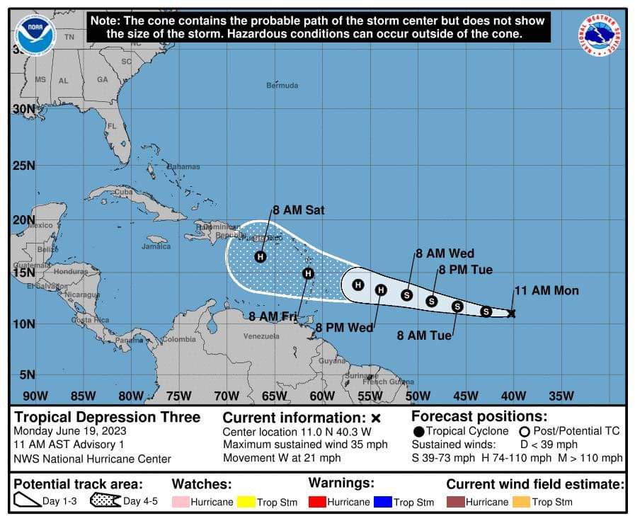 A las seis de la mañana, su posición central se estimó en los 14.8 grados de latitud norte y los 70.3 grados de longitud oeste, ubicándose aproximadamente a 415 kilómetros al sur de Santo Domingo, República Dominicana.