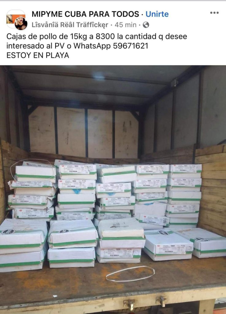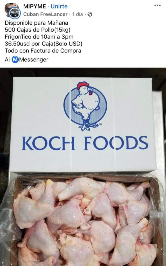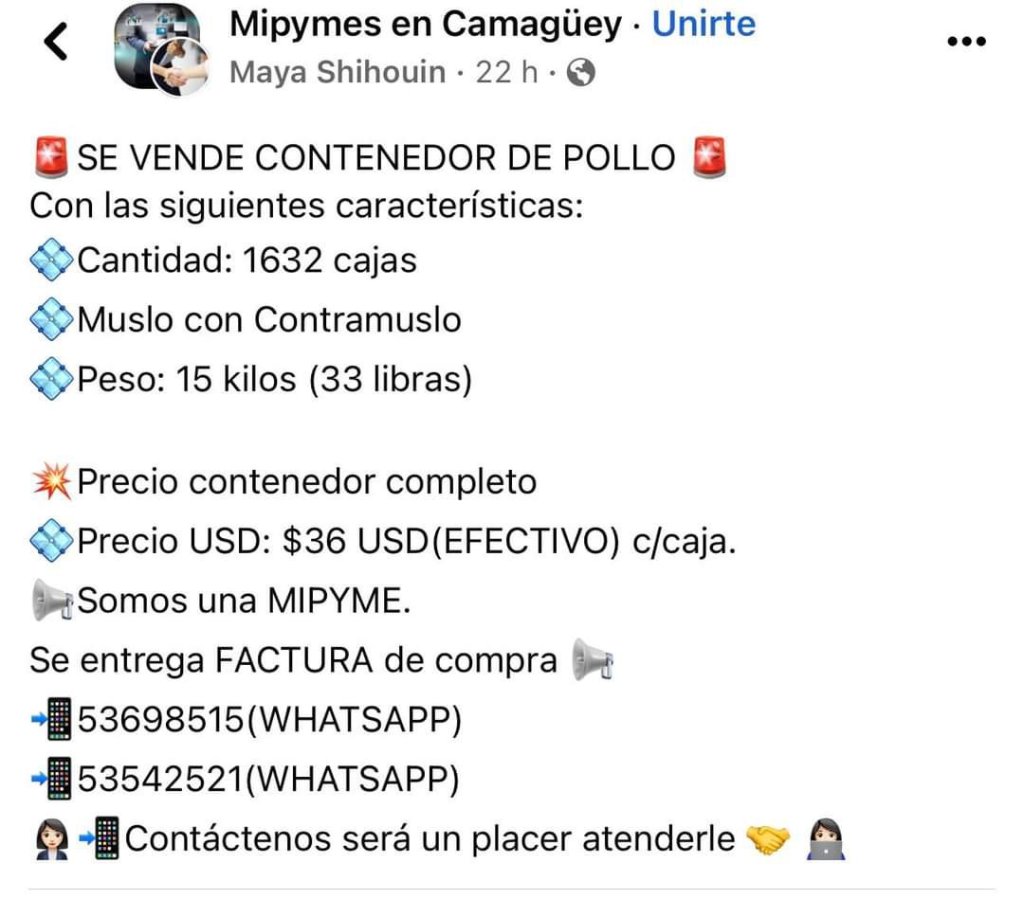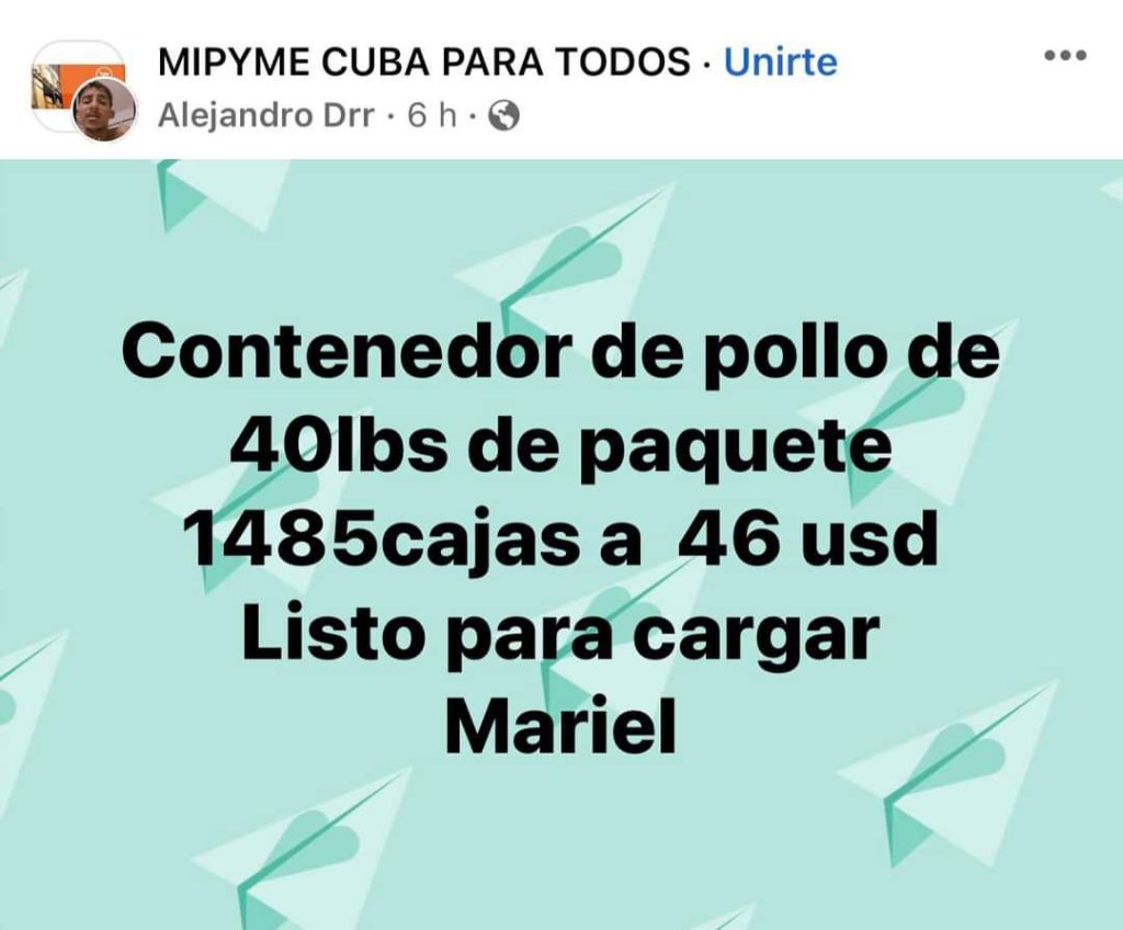Un cubano me escribió cuestionando sobre esta situación. Yo no soy economista, ni tengo la respuesta a cómo están comprando las MIPYMES contenedores de pollo para luego vender la caja a 36 o 46 dólares, según el peso. Como se puede ver en estas capturas de pantalla en grupos de Facebook.