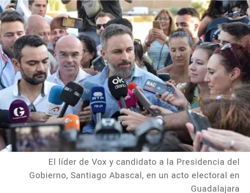 Mientras tanto el líder de Vox y candidato a las elecciones generales del 23 de julio, Santiago Abascal, ha asegurado este sábado estar «preocupado» viendo a dirigentes del PSOE hablar de «vuelco» y de «sorpresa» en los comicios. «Nos tememos lo peor», ha avisado sosteniendo que el PSOE «es capaz de cualquier cosa». Dijo en un mitin en Guadalajara
