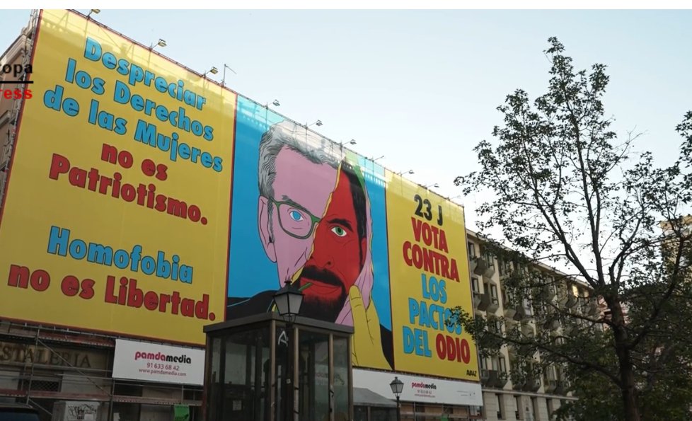 Mientras en la Junta Electoral de Madrid ha requerido a la fundación Avaaz que retire la palabra ‘vota’ de la lona desplegada en el madrileño barrio de Chueca en la que se podía leer ’23J, vota contra los pactos del odio, la misma fue retirada tras la petición de Santiago Abascal por delito de odio.